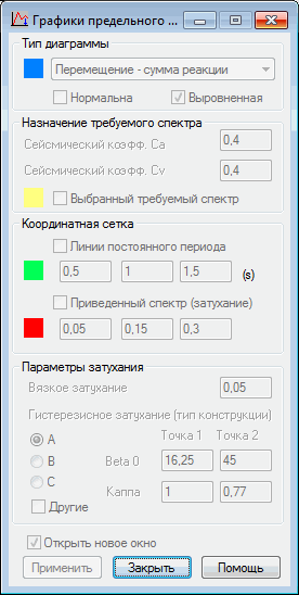 В поле "Назначение требуемого спектра" можно определить требуемый спектр (спектр движения грунта при землетрясении). Требуемый спектр определяется с помощью сейсмических коэффициентов Ca и Cv (см. нормы ATC-40, глава 4). При выборе параметра "Выбранный требуемый спектр" можно увидеть график, полученный в результате пересечения линий постоянного периода с должным образом вычисленными приведенными значениями спектра.