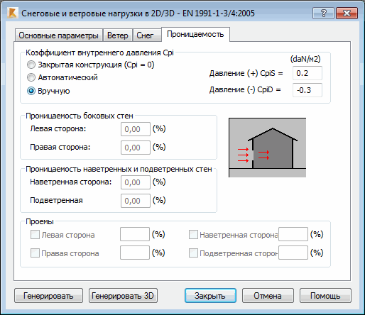 При переходе в диалоговом окне Снеговые/ветровые нагрузки на вкладку Проницаемость открывается следующее диалоговое окно.