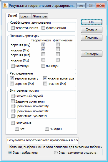 Данное окно позволяет выбирать величины и параметры, которые будут представлены в таблице результатов теоретического армирования стержней конструкции: