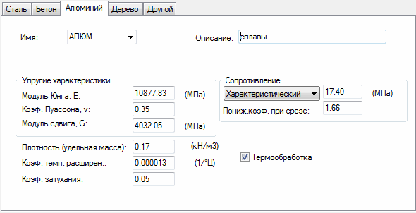 Выберите "Материалы" в диалоговом окне Рабочие настройки и нажмите кнопку "Изменить". выбрать вкладку "Алюминий" для доступа к следующим параметрам.