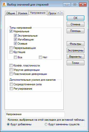 Если в диалоговом окне Выбор значений для стержней выбрана вкладка "Напряжения", то на экране появится следующее диалоговое окно.