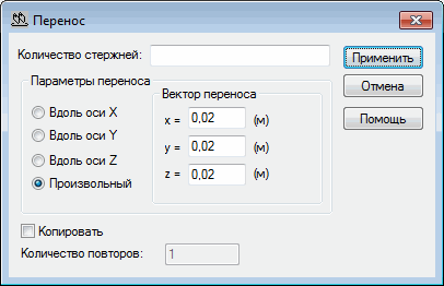 Опция используется для выполнения переноса выбранных арматурных стержней ж/б конструкции. Опция доступна в меню всех модулей, используемых для проектирования железобетонных конструкций (ж/б балки, ж/б колонны, фундаменты, балки-стенки).