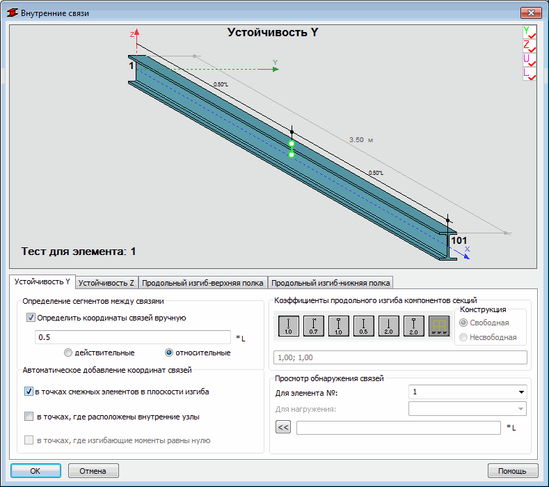 Используйте этот параметр для определения связей и боковых опор для всех анализируемых случаев потери устойчивости (потеря устойчивости при продольном изгибе, поперечная потеря устойчивости и кручение).