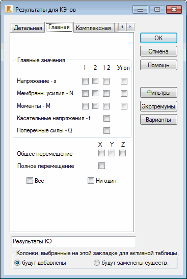 Если выбрать s1, s2 или s12, в таблице появятся колонки для значений напряжения s1, s2 или s12 соответственно, для отдельных поверхностных элементов КЭ в общей системе координат, выбранной во время расчета конструкции.