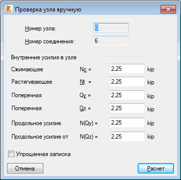После нажатия кнопки Расчет программа производит расчеты выбранного типа соединения для заданного узла конструкции. Будут определены внутренние усилия в соединении (N, Q, M).