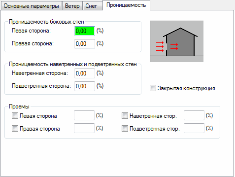 При переходе в диалоговом окне "Снеговые/ветровые нагрузки" на вкладку Проницаемость открывается следующее диалоговое окно.