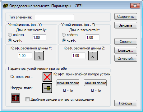 определение типа бокового выпучивания, определение положения нагрузки и определение коэффициента приведенной длины. Все эти опции могут быть выбраны в поле Параметры бокового выпучивания. Нажатие соответствующей иконки приводит к открытию диалогового окна, в котором можно определить соответствующие параметры.