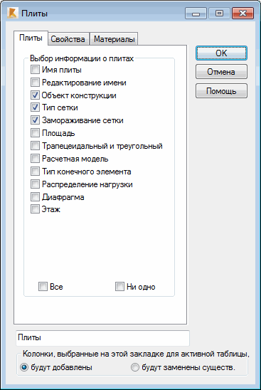 - Выберите Плиты и оболочки и нажмите кнопку ОК, чтобы открыть таблицу "Плиты".