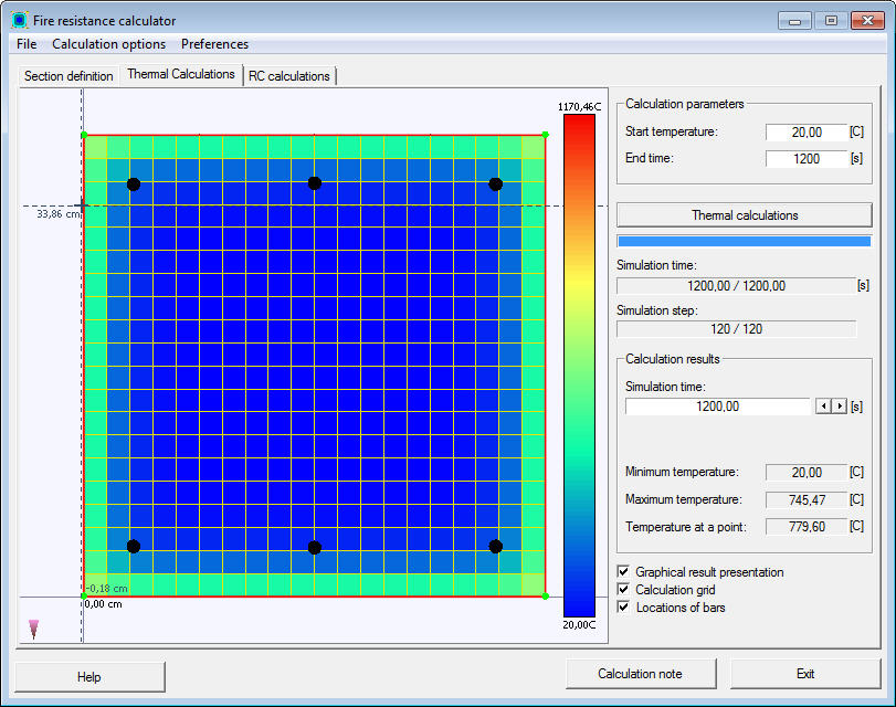 Нажмите кнопку Расчеты чтобы начать температурные расчеты для сечения. Процесс расчета представлен графически в поперечном сечении ж/б элемента (должен быть выбран параметр Графическое представление результата). Ход выполнения процесса отображается с помощью индикатора хода выполнения и изменения значения времени и шага моделирования (см. Параметры температурных расчетов).