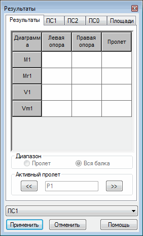 Набор имеющихся результатов может быть свободно скомпонован для 20 параметров (минимальные/максимальные величины моментов, поперечные силы, площади арматуры и т. д.). Чтобы упростить процесс анализа результатов были определены следующие категории результатов: ПС1, ПС2, ПС0, Площадь арматуры и Деформации. Каждая из перечисленных категорий содержит логически связанную группу результатов.
