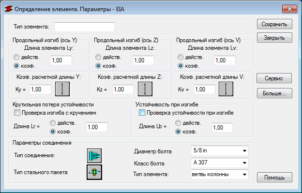 Поле Коэффициент расчетной длины позволяет определять коэффициенты расчетной длины элемента в обоих направлениях (Ky и Kz). Действительная длина элемента (сумма значений длины компонентов элемента) вводится в соответствующие поля автоматически.