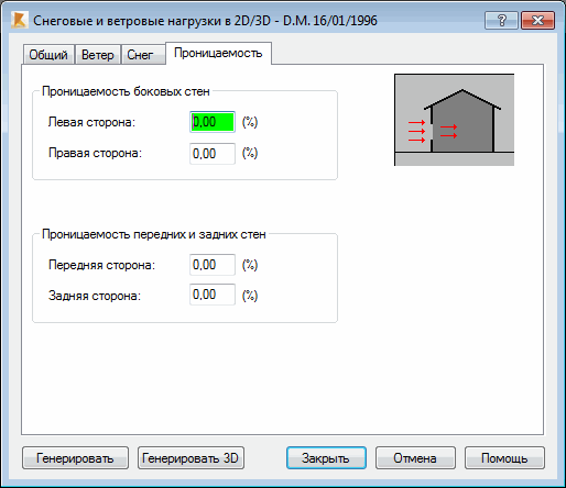 При переходе в диалоговом окне Снеговые/ветровые нагрузки на вкладку Проницаемость открывается следующее диалоговое окно.