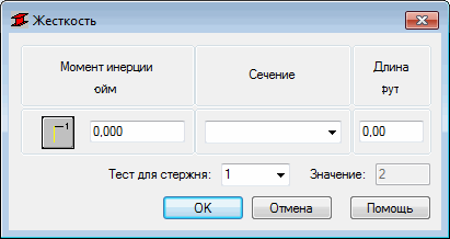 Как только присоединенный стержень с выбранным номером описан, в нижней части диалогового окна может быть проверен коэффициент продольного изгиба этого стержня. Значение коэффициента дается программой в поле Значение. Значение появляется после ввода номера очередного стержня в поле Тест коэффициента продольного изгиба для стержня.
