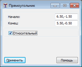 Если выбрала опция Относительно, и после этого определен прямоугольник, координаты второй вершины прямоугольника расчитаны относительно позиции первой вершины прямоугольника. Если включена опция Относительно, то координаты обеих вершин прямоугольника даны в принятой системе координат.