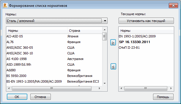 Это диалоговое окно используется для создания списка доступных кодировок для норм проектирования и нагрузок.
