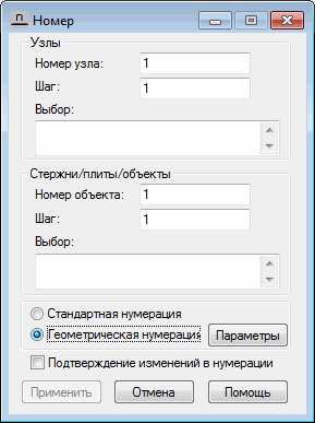 Выбор - список объектов (стержней, плит, дуг и тд), чьси номера будут изменены. Нумерация объекта определяется двумя параметрами: номером первого объекта и шагом нумерации. |