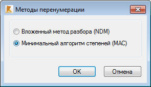 В программе доступны два метода перенумерации: вложенный метод разбора (NDM) и минимальный степенной алгоритм (MDA). Применение обоих методов состоит в редукции при факторизации ненулевых членов матрицы уравнений. Такие методы перенумерации применяются к так называемым разреженным матрицам, которые не имеют ленточной структуры. Поэтому, методы факторизации для таких матриц называются разреженными методами.