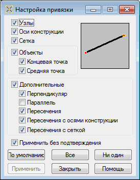 - По умолчанию – при нажатии этой кнопки выбираются основные установки захвата, включающие следующие опции: Узлы, Оси конструкции, Сетка, Объекты - концевая точка, Дополнительные - Пересечения;