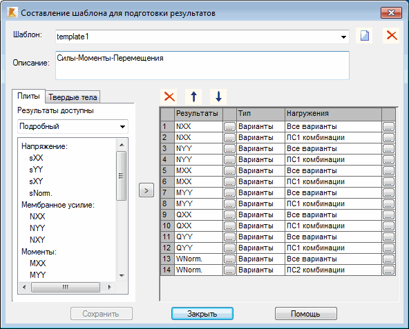 Доступные результаты могут быть перемещены в заданный шаблон после нажатия на кнопку >, представленные на вкладках Плиты или Твердые тела, .