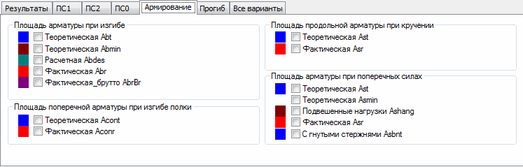 Дополнительно могут быть представлены площади продольной арматуры при кручении и поперечной арматуры при изгибе полки.
