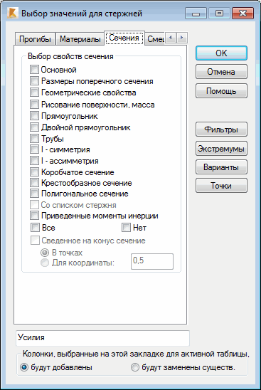 В этом диалоговом окне могут быть выбраны следующие данные по сечениям: