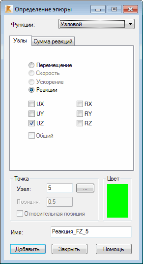 В поле Точка выбирается узел/стержень/элемент. Можно ввести номер в соответствующее поле редактирования.