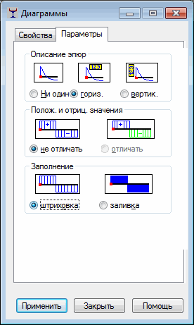 На вкладке "Параметры" в диалоговом окне "Диаграммы" (тонкостенные сечения) вы можете выбрать предпочтительный способ представления эпюр.