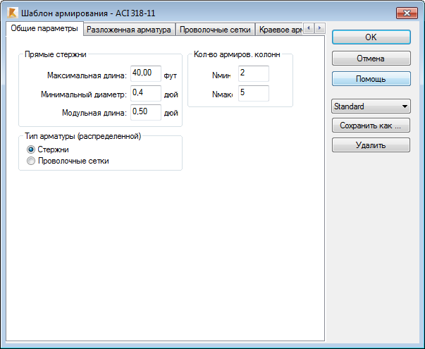 С помощью команды Удалить можно удалить выбранный набор параметров шаблона армирования.