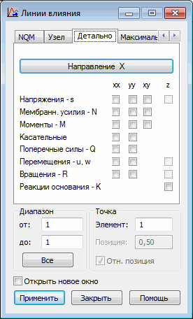 Опции, содержащиеся в показанном выше окне, позволяют пользователю указать те связанные с поверхностью величины (определенные для пластин или оболочек), для которых будут представлены линии влияния: