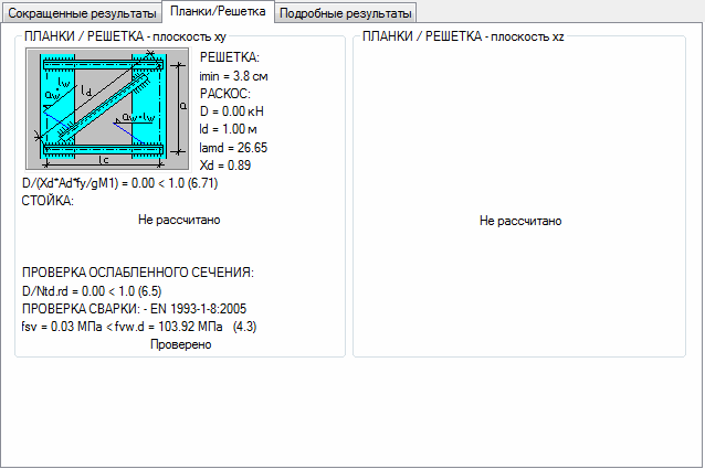 Чтобы начать расчет соединений поясов, пользователь должен нажать на кнопку Вычисления. В диалоговом окне Детальные результаты появляется дополнительная вкладка "Планки/Решетка", содержащая наиболее важные результаты по проверке соединения (общие данные и результаты проверки в табличной форме).