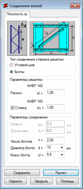 Проверка соединения элементов решетки с сечением колонны производится упрощенно. Для угловых сварных соединений программа запрашивает полную длину сварных швов, соединяющих решетку с сечением колонны и, принимает, что сила тяжести сварной системы коллинеарна оси элемента (система подвержена только сдвигу без учета возможных эксцентриситетов). Для болтовых соединений также принимается, что ось сечения и ось позиций болтов являются коллинеарными. Поэтому несущая способность такого соединения равна суммарной несущей способности всех болтов, использованных в соединении.