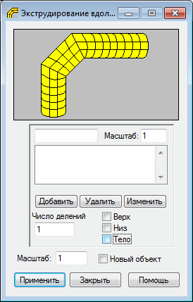 Полилинию можно определить графически (в последовательных точках полилинии) или текстуально (определяя координаты в последовательных точках полилинии). Последовательные точки полилинии вводятся в соответствующее поле редактирования диалогового окна "Выдавливание вдоль полилинии". Точки можно удалять или модифицировать (определив новые координаты точки и значение масштаба, затем нужно нажать на кнопку Изменить).