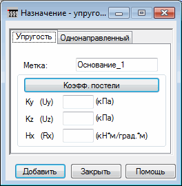 В верхней части диалогового окна имеется редактируемое поле Метка для определения метки (имени) нового типа упругого основания. В поле Коэфф. постели расположены поля редактирования для значений коэффициентов упругости основания. Значения этих коэффициентов в соответствующих направлениях задаются в местной системе координат. Они должны быть заданы в следующих единицах измерения: