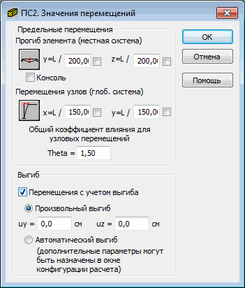 В случае некоторых конструкций необходимо увеличивать перемещения всех узлов конструкции. В соответствии с этим был введен глобальный коэффициент Тета, который вызывает увеличение всех перемещений (значение коэффициента по умолчанию равно 1.5).