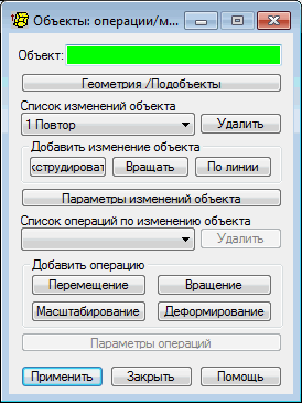 Операции по модификации объекта могут быть удалены. Если из списка выбрана операция по модификации объекта и нажата кнопка Удалить (около Списка операций по модификации объекта), выбранная модификация удаляется из списка. После выбора операции по модификации объекта и нажатия кнопки Параметры операции, диалоговое окно Объекты: операции/модификации расширяется и в нем можно задать параметры выбранной операции по модификации объекта (Перенос, Вращение, Масштабирование и Деформация).