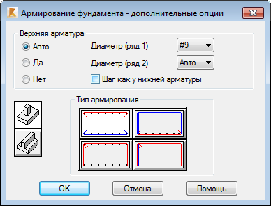 Диалоговое окно "Армирование фундамента — дополнительные опции" позволяет задавать дополнительные параметры армирования фундамента.