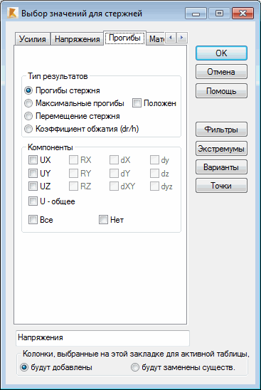 Когда в диалоговом окне Выбор значений для стержней выбрана вкладка Прогибы, то на экране появляется следующее диалоговое окно.