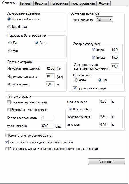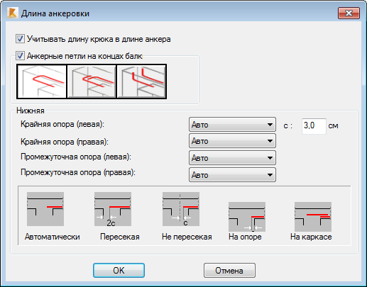 Анкеровка - дополнительная полезная опция в управлении армированием в слоях. При щелчке на кнопку Анкеровка открывается диалоговое окно, в котором определяются параметры анкеровки.