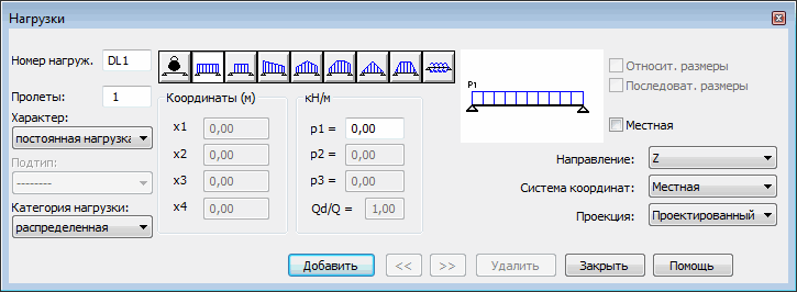Правая сторона диалогового окна Нагрузки зависит от категории нагрузок. Схематическая иконка отображающая выбранную распределенную, сосредоточенную или поверхностную нагрузку, отображается в верхней части диалогового окна. Иконки позволяющие выбрать тип нагрузки, расположены слева от схематических иконок..