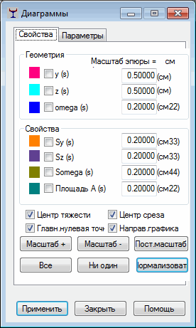 На вкладке "Свойства" в диалоговом окне Графики (тонкостенное сечение) можно выбрать свойства тонкостенного сечения, для которого будут представлены графики.