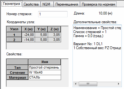 При переходе на вкладку "Геометрия" в диалоговом окне Свойства стержня.