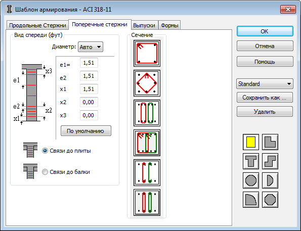Рекомендуемые шаблоны поперечного армирования в сечении. Список образцов соответствует выбранному сечению колонны. В соответствии с выбранными образцами и их последовательностью в программе будет принято оптимальное решение.