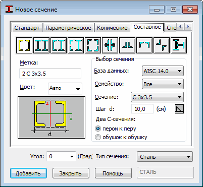 На экране появляется вкладка Составное сечение в диалоговом окне Новое сечение.