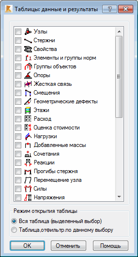 - Вся таблица (выбор выделен) — если эта опция активна, открывается вся таблица. Сроки таблицы, относящиеся к выбранным узлам/стержням/объектам, подсвечены.