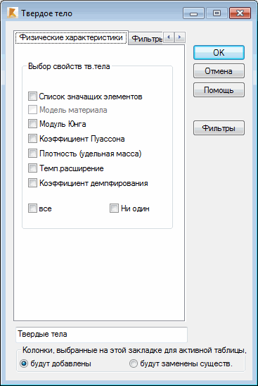 В этом диалоговом окне могут быть выбраны для представления в таблице следующие величины, относящиеся к твердым телам:
