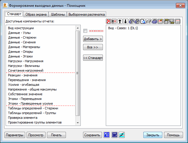 Диалоговое окно разделено на две панели: левую и правую. На левой панели представляются объекты, выбранные для печати (ее содержимое зависит от выбранной вкладки). Правая панель содержит полный отчет, составленный пользователем из объектов доступных на левой панели. Для подготовки содержимого распечатки перемещают объекты с левой панели на правую, используя две кнопки: Все и Добавить. При нажатии на кнопку "Все" все доступные объекты перемещаются вправо. При нажатии на кнопку Добавить с левой панели перемещаются только выделенные объекты. Если пользователь составляет необходимую ему распечатку и желает сделать ее состав стандартным, ему необходимо нажать на кнопку "Стандартная". Все компоненты, содержащиеся на правой панели, будут перенесены на левую панель вкладки "Стандартная".
