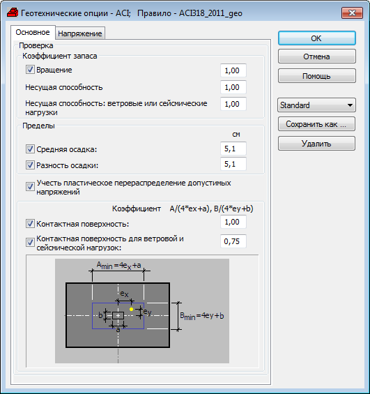 В этом диалоговом окне можно выбрать условия, определяющие способ проектирования фундамента. Содержимое этого диалогового окна зависит от выбранных геотехнических норм (проектирование фундамента).