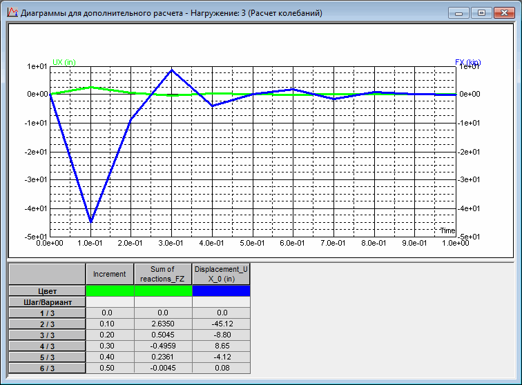 Опция организует построение графиков результатов, полученных в процессе более сложных расчетов, которые для краткости условно названы – "дополнительные расчеты". К более сложным расчетам относятся решения геометрически и физически нелинейных задач, нелинейный анализ предельного состояния стержневых конструкций при сейсмических воздействиях (анализ предельного состояния) и исследование динамических процессов, разворачивающихся во времени (анализ динамических процессов). Диаграммы (графики) позволяют пользователю наглядно представить результаты (значения перемещений, внутренних сил, напряжений), полученные в процессе решения перечисленных выше задач итерационными методами последовательных пошаговых приращений.