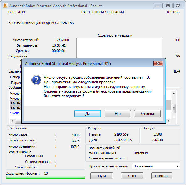 При выборе модального расчета и процент участия масс для заданного максимального числа узлов меньше, чем требуется, пользователь получает сообщение о неудовлетворительности процента участия масс, в то время как вычисления заканчиваются без внесения исправлений.