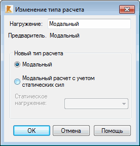 Это диалоговое окно используется для изменения типа анализа на Модальный или Модальный расчет с учетом статических усилий.
